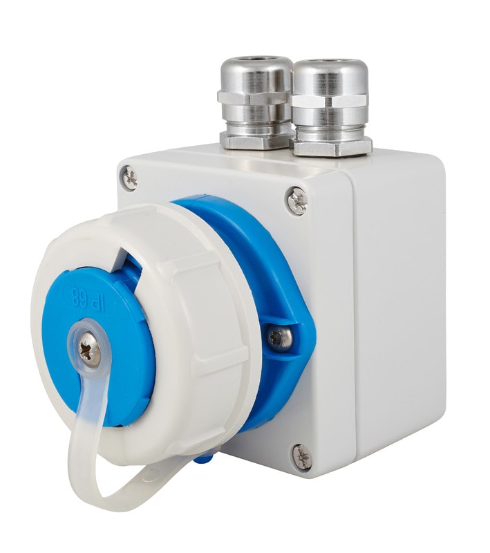 Vesitiivis pistorasia suojauslukolla IP67/68, suunniteltu ankaraan käyttöön! Teollisuuden ankariin olosuhteisiin; pesuhallit, laivat, satamat, ankarat olosuhteet.