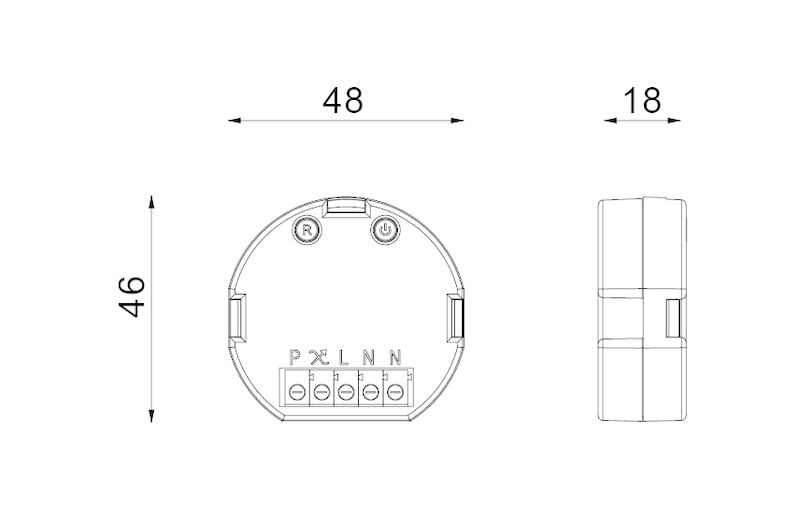 LEDDim Smart Pill Micro -himmennin, joka voidaan asentaa välikattoon, seinärasiaan tai vastaavaan yhden tai useamman valaisimen ohjaamiseksi. Ohjaus Bluetooth-sovelluksella (BLE), Smart Switch -painikkeella tai painonapeilla.