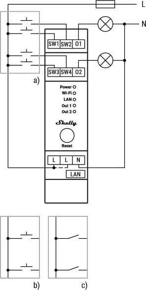 Himmentimet voidaan syöttää 110-240 VAC:lla. Molemmissa on kaksi syöttöä per himmenninkanava, mikä mahdollistaa 2-painikkeen toiminnan. Oletusasetuksena ne on ohjelmoitu toimimaan yhden jousipainikkeen kanssa. Molemmat syötöt ovat täysin ohjelmoitavia, mikä tarkoittaa, että lisäsyöttöä voidaan käyttää myös toisen Shelly-laitteen ohjaamiseen.