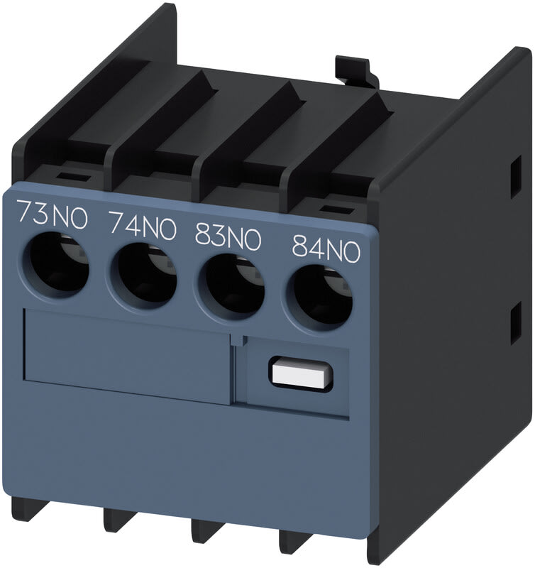 Apukontaktit edessä, 2 NO virtatie 1 NO, 1 NO Kytkentä ylhäältä 3RH- ja 3RT-ruuviliittimelle 73/74, 83/84