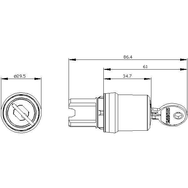 avainkytkin Siemens, 22 mm, pyöreä, muovi, lukkonumero SSG10, 2 avainta, 2 kytkimen asentoa O-I, salpa, käyttökulma 90°, 10:30h/13:30h, avaimen poisto O+I