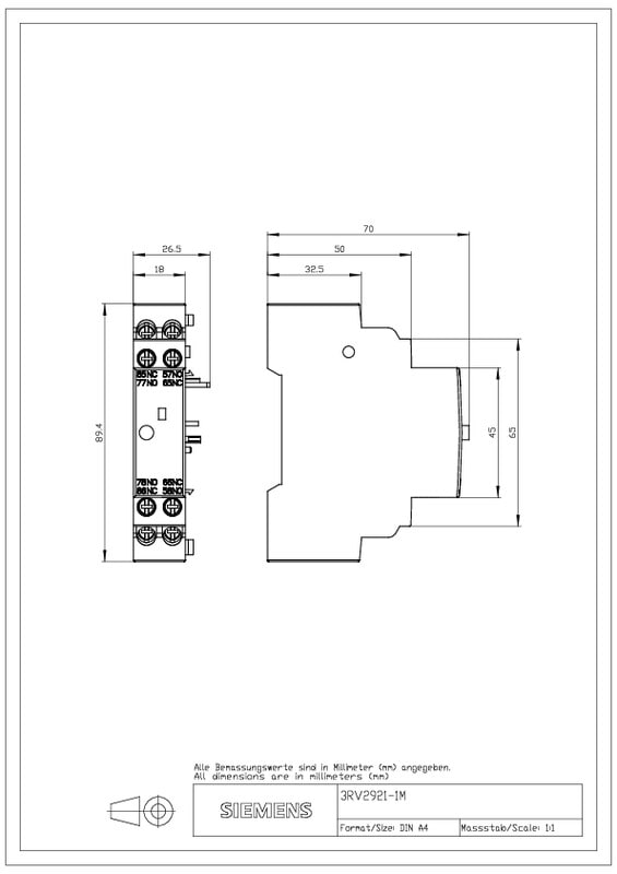 SIEMENS - Hälytyskosketin 3RV2 - 3RV2921-1M vas. sivulle S00-S3