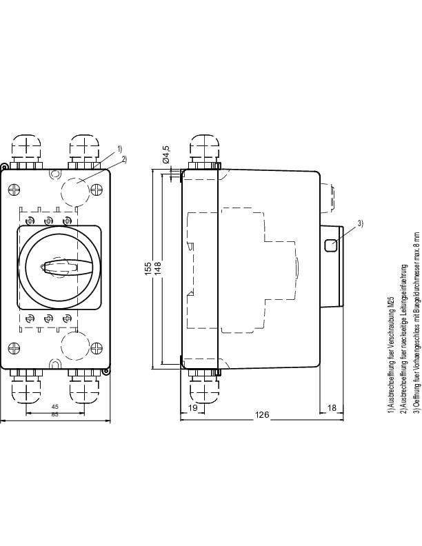 Valettu muovikotelo pinta-asennukseen. Suojausluokka IP55. N- ja PE-liitännällä. Voidaan lukita O-asentoon. 54 mm läpivientiholkilla. Ei UL/CSA-hyväksyntää.