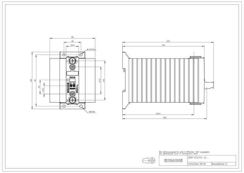 Puolijohdekontaktori 1-vaiheinen 3RF2 AC 51 / 70 A / 40 °C 48-460 V / 110-230 V AC Rengaskaapeliliitäntä 21.5.2018 alkaen mitat ja porauskuvio ovat muuttuneet.