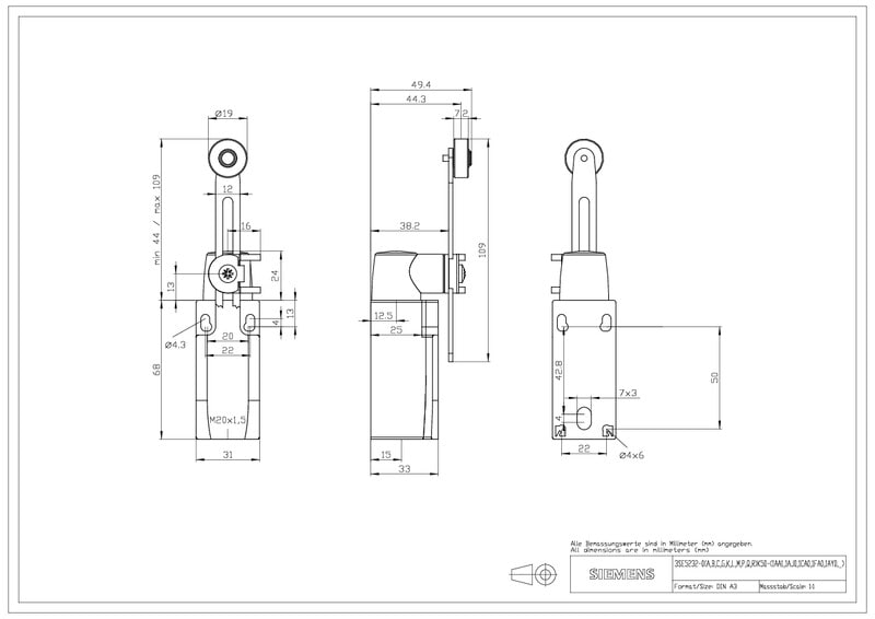 Asentokytkin Muovikotelo EN 50047 mukaan, 31 mm Laiteliitäntä 1 x (M20 x 1,5) 1 NO/2 NC pikakoskettimet säädettävä pituus kiertovipu oikea/vasen säädettävissä muovirullalla 19 mm