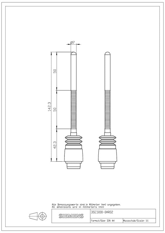 Toimipää: jousitanko asentokytkimille 3SE51/52, vain napsautuskoskettimilla, kokonaispituus 142,5 mm jousi = 50 mm, mäntä = 50 mm, ruostumatonta terästä