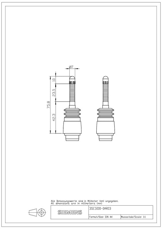 Toimipää: jousitanko asentokytkimille 3SE51/52, vain napsautuskoskettimilla, kokonaispituus 76 mm, jousi = 23,5 mm, mäntä = 10 mm, muovia