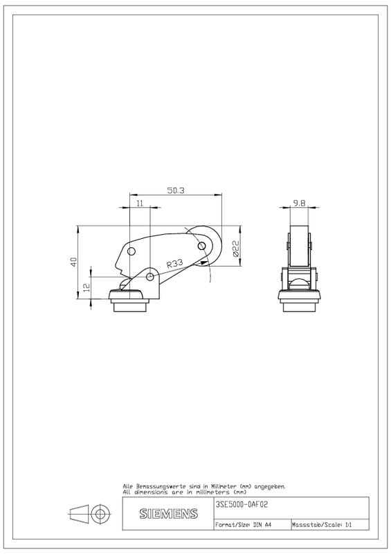 Toimipää asentokytkimelle 3SE51/52 Kulmarullan vipu Metallivipu ruostumattomasta teräksestä valmistetulla rullalla 22 mm