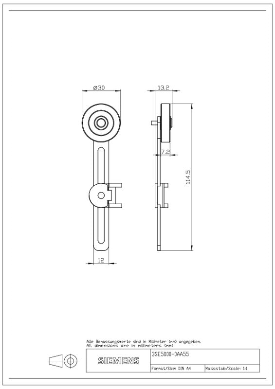 Säädettävä pituus Kääntövipu asentokytkimelle 3SE51/52 Metallivipu 100 mm pitkä Muovirulla 30 mm