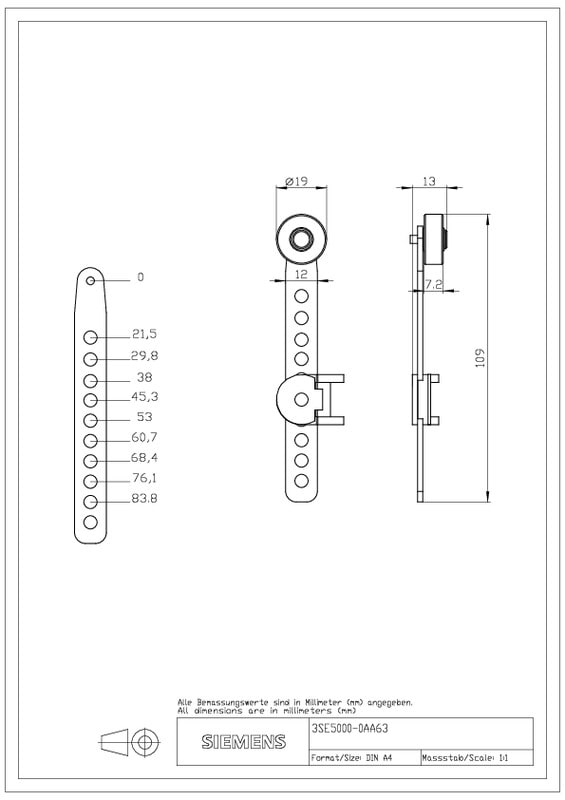 Säädettävä pituus Kääntövipu asentokytkimelle 3SE51/52 Ruostumaton teräsvipu 100 mm pitkä ruostumattomasta teräksestä valmistettu liitin Positiivinen sovitus (ristikon reikä) Ruostumaton teräsrulla 19 mm