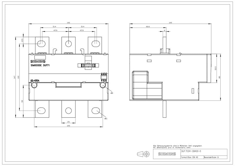 Virranmittausmoduuli, asetusvirta 63...630 A Kokonaisleveys 145 mm, virtakiskoliitäntä