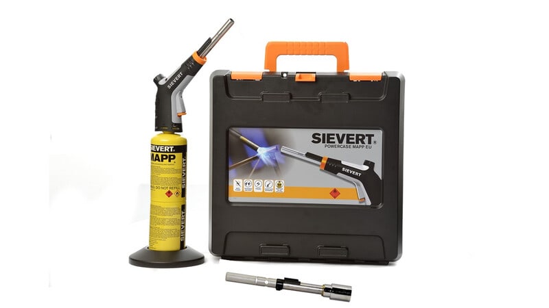 Sievert 2535 Powerjet-sarja kutistamiseen laukussa; pyörre- ja pehmeäliekkipoltin, MAPP-kaasusäiliö, Powercase-laukku. Sievert 2535 Powerjet-sarja laukussa kutistamiseen. Sarja sisältää Powerjet 2535 2 bar-kahvan piezo-sytytyksellä ja päälle/pois-liipaisimellla. Mukana 2 poltinta; pikavaihdettavat pyörre-(14mm) ja pehmeäliekkipolttimen sekä kaikkiin vuodenaikoihin, lämpimästä kylmimpään, sopivan Sievert MAPP-tehokaasun (222183 EU-kertasäiliö 380g). Nämä toimitetaan Powercase-laukussa, jossa tilaa mm. lisäkaasulle.