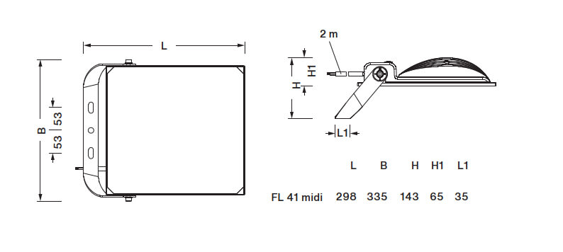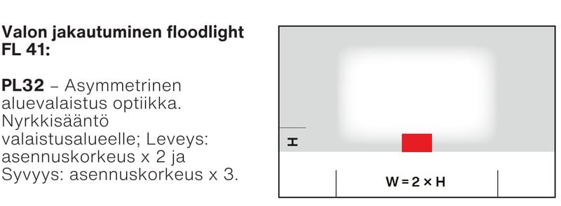 dFL41 on PL32-optiikalla varustettu tehokas valonheitin monipuoliseen aluevalaistukseen. Valaisin on saatavilla 2 runkokoossa (mini ja midi) ja sen käyttökohteina on mm. logistiikkakeskusten lastauslaiturit, varastorakennusten seinät, parkkipaikat, työmaa-alueet sekä rakennusten julkisivut. . Valmiiksi koottujen kiinnikkeiden ja liitäntäkaapeleiden ansiosta FL41 voidaan asentaa nopeasti ja helposti.