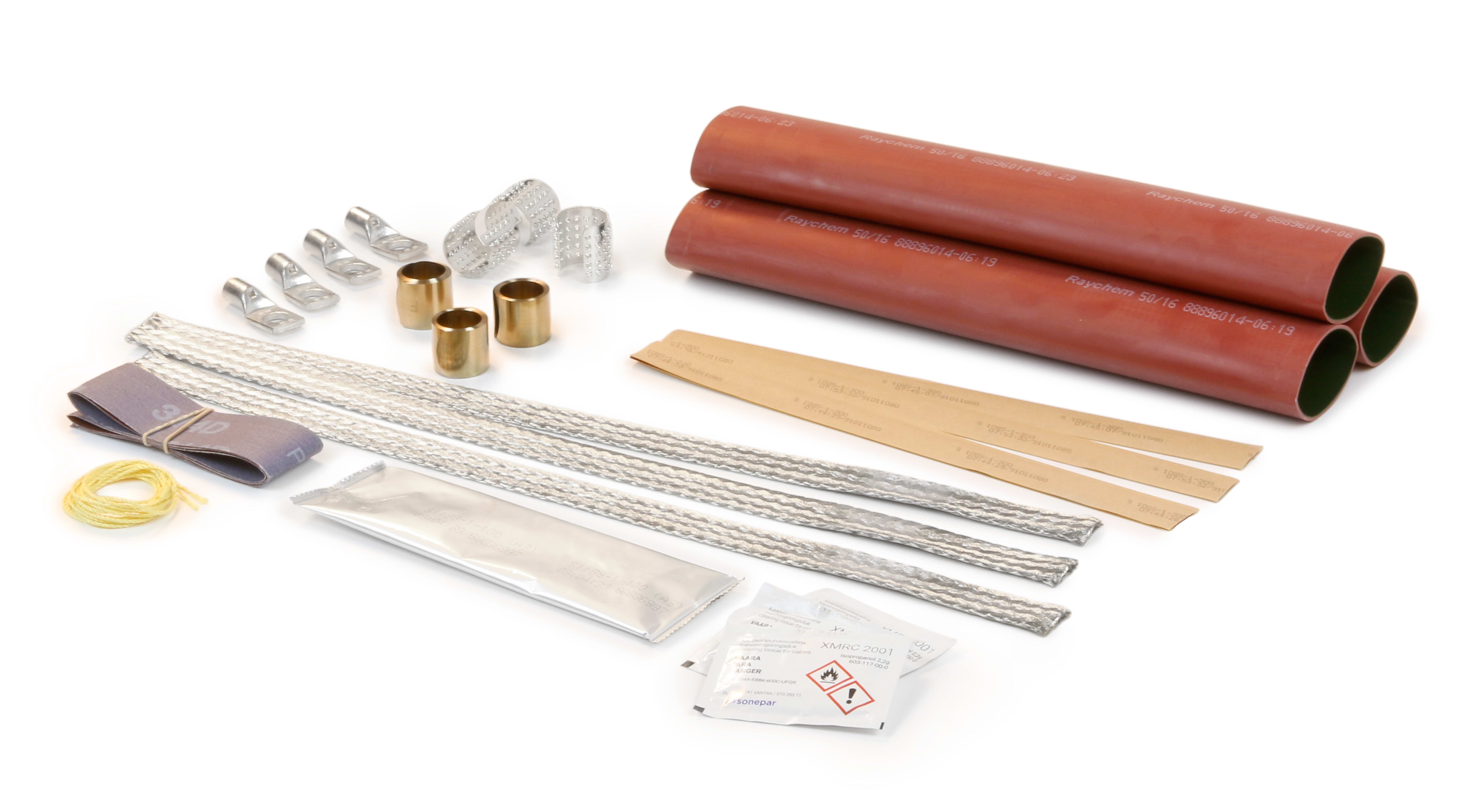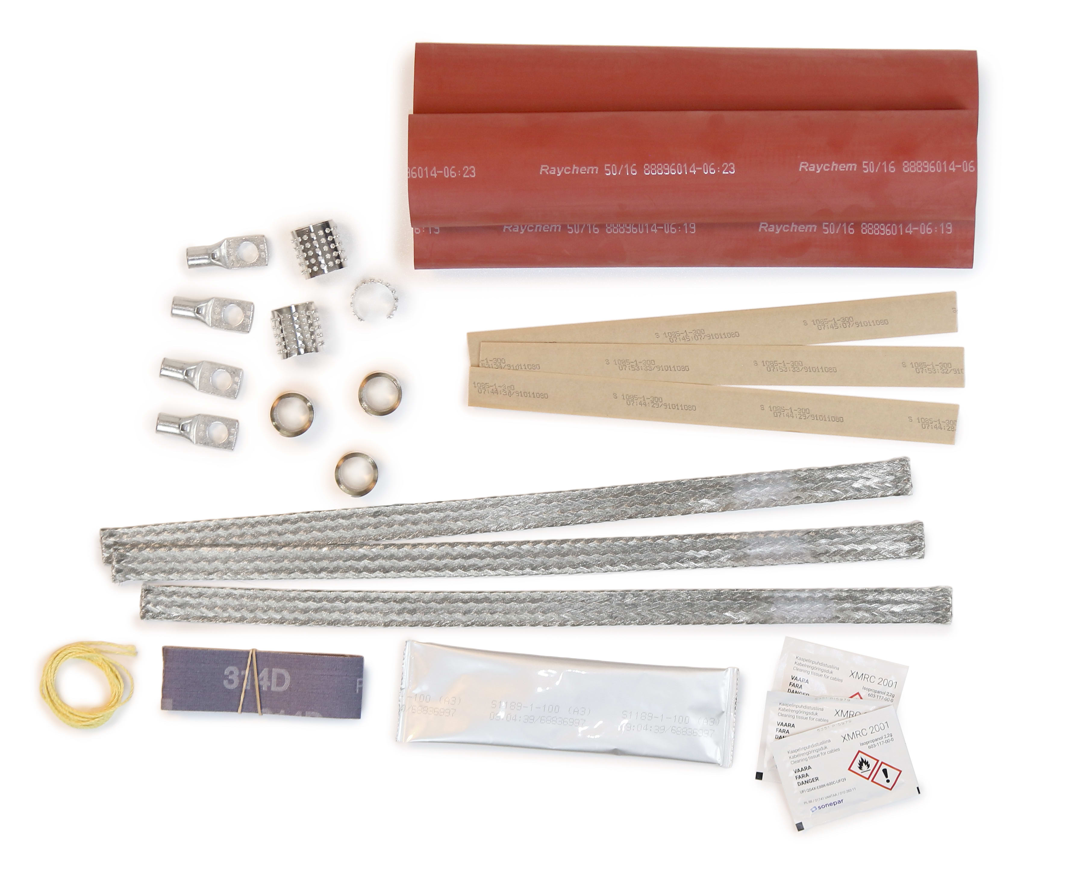 Kutistesisäpääte kaapelille AHXAMK-W 3x70-240 mm2 20 kV. Al-folionmaadoitusliitos kontaktilevyllä ja jousikiristimellä. Vaihejohtimien