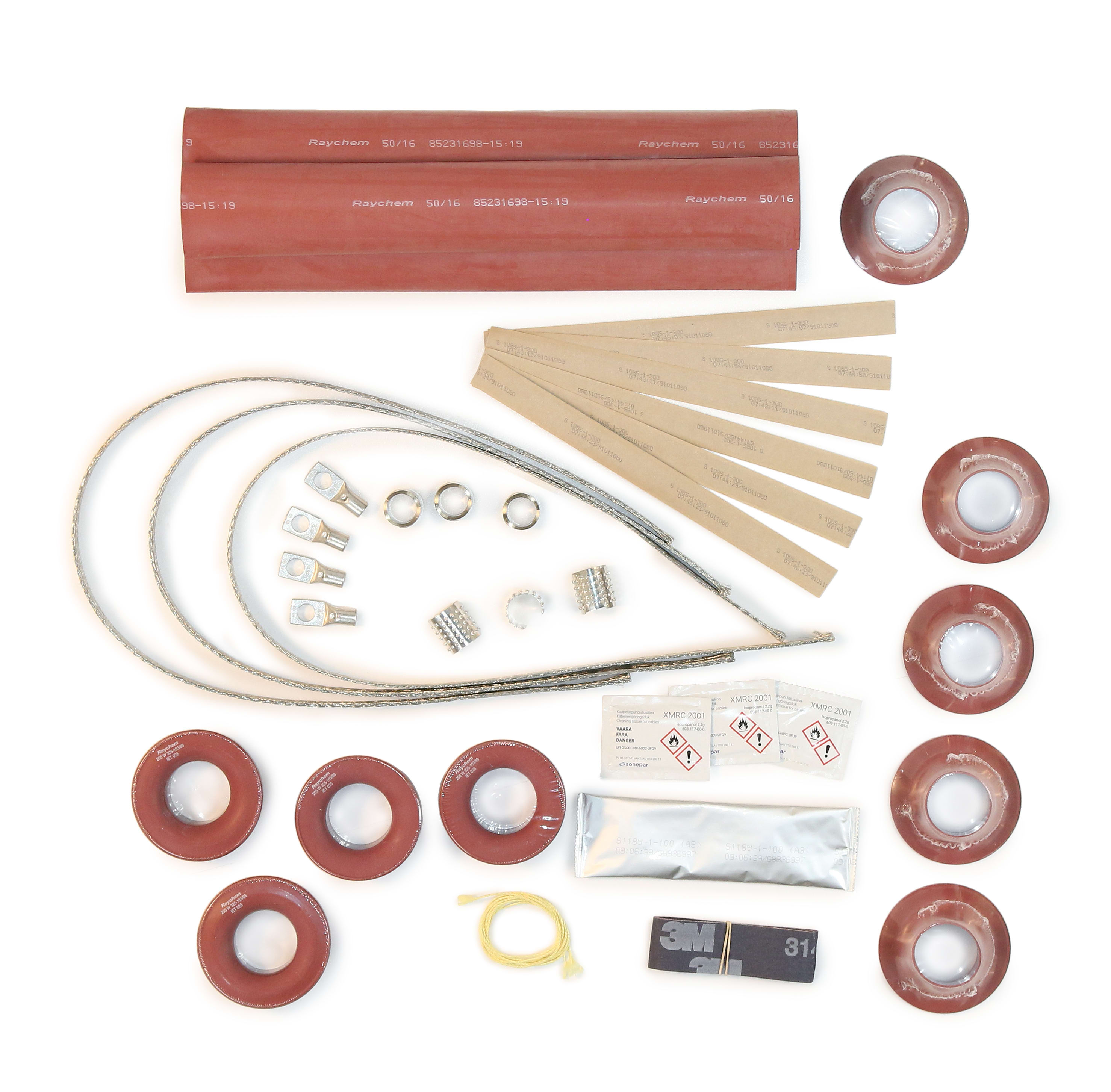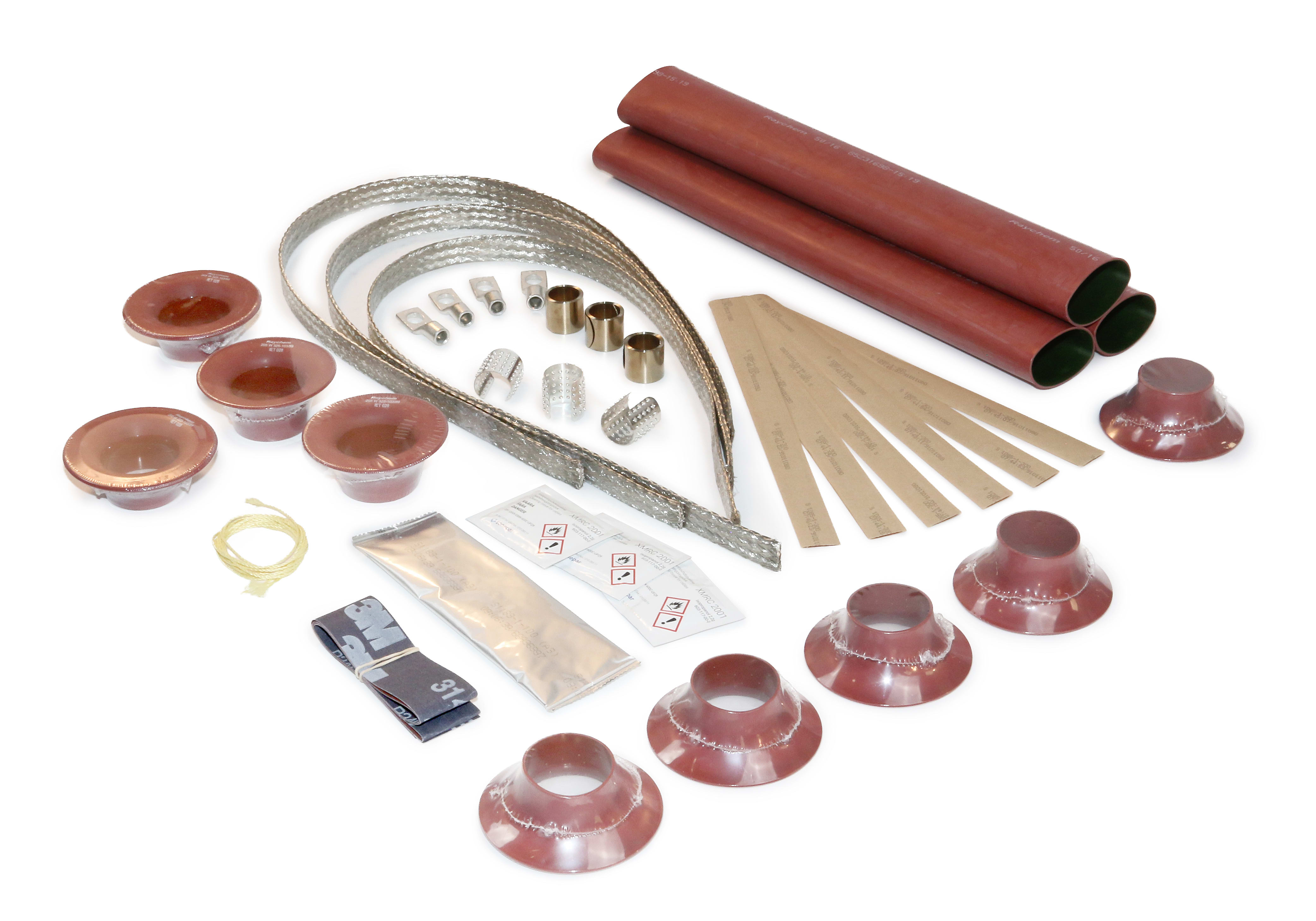 Kutisteulkopääte kaapelille AHXAMK-W 3x70-240 mm2 20 kV. Al-folionmaadoitusliitos kontaktilevyllä ja jousikiristimellä. Vaihejohtimien