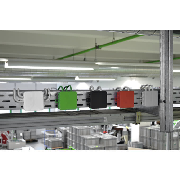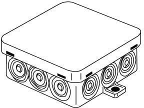 Jakorasia standardin DIN EN 60670 mukainen (VDE 0606), 12 läpivientiä, kolme läpivientiä pohjassa, mukana reikätyökalu ja sulkutulppa, ulkopuoleisilla kiinnityskorvakkeilla