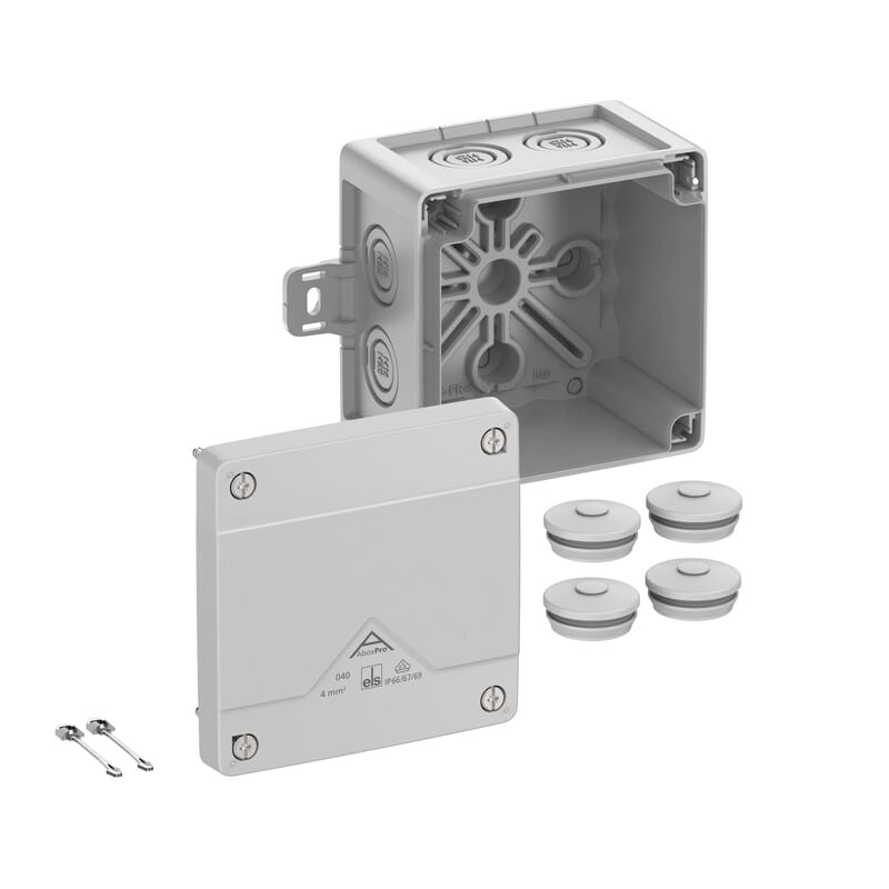 kytkentäkotelona, Suojaluokiteltu IP66/IP67/IP69, Nimellinen poikkileikkaus 4 mm², Sertifioitu VDE (DIN EN 60670-1/-22 (VDE 0606-1/-22)), DLG (ammoniakinkestävyys), DNV (luokka: laivat ja offshore-asennukset), metriset läpilyöntiaihiot M16/M20/M25, (1 Takaosa, 7 Puoli), Ulkoiset kiinnityspisteet, asennuksiin teollisuusympäristössä ja suojaamattomissa ulkotiloissa, harmaa, Ui=1000 V AC, ilman liittimiä Mitat: 102 x 102 x 70 mm Sisältää tarvikkeet: 4 kaksoiskalvotiivistettä IP66 M25 tiivistysalue 9–17 mm, kannen putoamissuoja