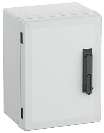 Kytkentäkaappi - teollisuuslaatu, sopii asennettavaksi vaativiin ympäristöihin ja suojaamattomiin ulkotiloihin, kotelo ja runko: lasikuituvahvistettu polykarbonaatti, harmaa, vastaava kuin RAL 7035, ovi: Polykarbonaatti. Kääntövipu profiilipuolisylinterin kiinnittämiseen DIN-normin 18252 mukaisesti harmaalla ovella