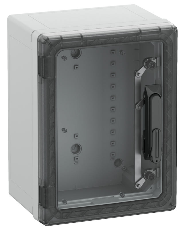 Sopii asennettavaksi vaativiin ympäristöihin ja suojaamattomiin ulkotiloihin, kotelo ja runko: lasikuituvahvistettu polykarbonaatti, harmaa, vastaava kuin RAL 7035, ovi: Polykarbonaatti. Kääntövipu profiilipuolisylinterin kiinnittämiseen DIN-normin 18252 mukaisesti läpinäkyvällä ovella
