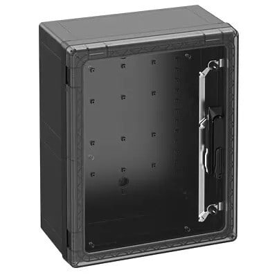Kytkentäkaappi - teollisuuslaatu, sopii asennettavaksi vaativiin ympäristöihin ja suojaamattomiin ulkotiloihin, kotelo ja runko: lasikuituvahvistettu polykarbonaatti, musta, vastaava kuin RAL 9005, ovi: Polykarbonaatti. Kääntövipu profiilipuolisylinterin kiinnittämiseen DIN-normin 18252 mukaisesti läpinäkyvällä ovella