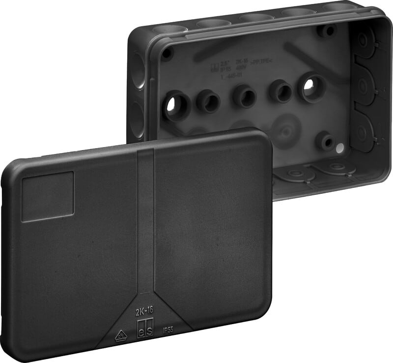 kytkentäkotelona, Suojaluokiteltu IP55, Nimellinen poikkileikkaus 2,5 mm², Ui=400V AC, Sertifioitu VDE (DIN EN 60670-1/-22 (VDE 0606-1/-22)), Itsetiivistyvät, joustavat läpivientien kalvotiivisteet, Tiiveysalue 2 - 14 mm, (3 Takaosa, 16 Puoli), Sisäiset kiinnityspisteet, tavallisiin sisäasennuksiin musta, ilman liittimiä.