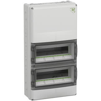 Pieni moduulikotelo - teollisuusmalli - 2-rivinen, 28 moduulia, DIN-asennuskiskojen väli 150 mm, integroiduilla tuuletusventtiileillä kondenssiveden muodostumisen vähentämiseksi, ylhäällä kalvotiivisteet valmiina, DIN-peitelevy ja merkintäliuska, ylimääräisillä kaksoiskalvotiivisteillä ja muilla tarvikkeilla.