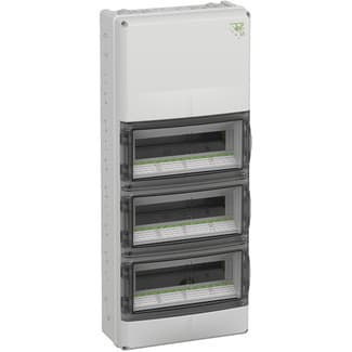 Moduulikotelo - teollisuusmalli -, 3-rivinen, 42 moduulia, DIN-asennuskiskojen väli 150 mm, integroiduilla tuuletusventtiileillä kondenssiveden muodostumisen vähentämiseksi, ylhäällä kalvotiivisteet valmiina, DIN-peitelevy ja merkintäliuska, ylimääräisillä kaksoiskalvotiivisteillä ja muilla tarvikkeilla.