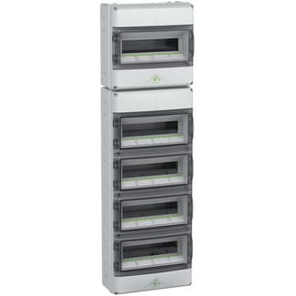 Moduulikotelo - teollisuusmalli -, koostuu kahdesta erillisestä kotelosta, laipan kiinnitystangot ja laipat AFL 1 ja AFL 2, 1+4-rivinen, 70 moduulia, DIN-asennuskiskojen väli 150 mm, integroiduilla tuuletusventtiileillä kondenssiveden muodostumisen vähentämiseksi, PE/N-liitinkisko jousiliittimin sekä kuudella ruuviliittimellä, 2,5 - 16 mm², 22 / 2 x 14 liitinkisko 1,5 mm–4 mm² jousiliittimin, ylhäällä kalvotiivisteet valmiina, DIN-peitelevy ja merkintäliuska, ylimääräisillä kaksoiskalvotiivisteillä ja muilla tarvikkeilla.