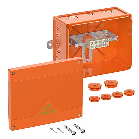 Kaapeleiden haaroitus- ja liitosrasia, IP66. Standardien EN 60670 ja IEC 62208 mukaisesti. Paloluokka E30 – E90 standardin DIN 4102 osan 12 mukaisesti. Halogeeniton kotelo termoplastista erikoismateriaalia, liittimet korkeita lämpötiloja kestävästä erikoiskeramiikasta, kiristimet vapaasti sijoitettavissa, pika-asennus ulkokiinnityslaipoilla Sisältää tarvikkeet: Kansivarmistus, ruuviankkuri, 4 kaksoiskalvotukea IP66 M32 sopii tiivistysvälille 14 - 21 mm, 2 kaksoiskalvotukea IP66 M40 sopii tiivistysvälille 19 - 28 mm Liitosrasia 5 napainen 1,5 - 16 mm², haaroituskotelo 5 napainen 1 - 6 mm², liitettävien johdinten lukumäärä / napa: 10 x 1,5² / 8 x 2,5² / 4 x 4² / 4 x 6² / 2 x 10² / 2 x 16²