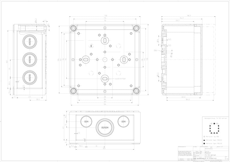Riviliitinkotelot, polystyreeniä, vaaleanharmaa vastaava kuin RAL 7035, sis. neljä kalvotiivistettä M20, 8 - 13,5 mm kaapeleille, IP54, yksi kalvotiiviste M25, 9 - 18,5 mm kaapeleille, IP54