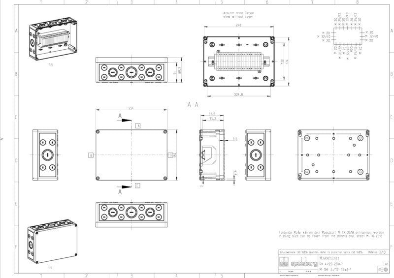 RKi 4/25-25-4² Riviliitinkotelo 25 ruuviliitintä ja DIN-kisko, IP54/IP66 harmaa, 254x180x90mm Riviliitinkotelot, polykarbonaattia, harmaa vastaava kuin RAL 7035, sis. kahdeksan kalvotiivistettä M20, 8 - 13,5 mm kaapeleille, IP54, kaksi kalvotiivistettä M25, 9 - 18,5 mm kaapeleille, IP54, yksi kalvotiiviste M32, 13 - 23 mm kaapeleille, IP54
