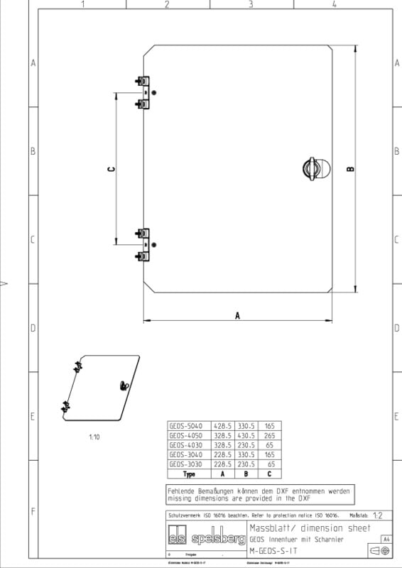 Sisäovi GEOS-kytkentäkaappiin asennukseen, sis. kiinnitysmateriaalit jakiertosalpa-avaimen, 3 mm kaksipuolinen, erilliseen käyttöön esim.näyttöjen, ohjaus- ja merkinantolaitteiden asentamiseen, materiaalinpaksuus: 4 mm, GEOS-S 4050:lle