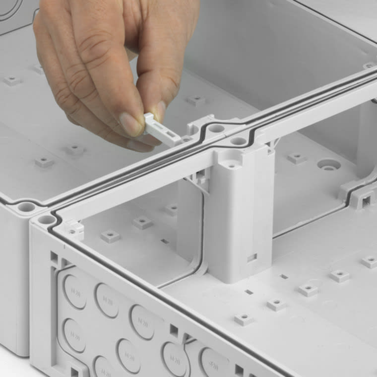 Liitospakkaus, rinnakkain tai päällekkäin yhdistelyyn kaikille AK-koteloille ja AKi-koteloille koosta 300 x 150 mm lähtien, täydellinen pakkaus, mukana yhdistyskiilat ja tiiviste koteloiden väliin, 150 ja 300 mm:n kotelosivuille, kukin 300 mm = 1 liitospakkaus.