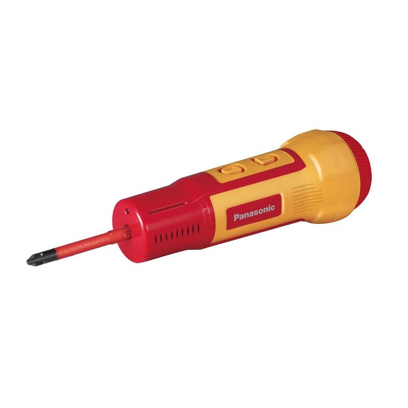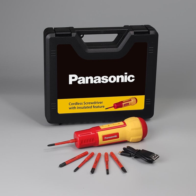 PANASONIC Akkuruuvimeisseli VDE 7-osainen. Toimitetaan salkussa. Mukana kärkisarja, joka sisältää: PZ1 (75mm) x 1, PZ2 (75mm) x 1, PH1 (75mm) x 1, PH2 (75mm) x 1, SL4.0 (0.8/75mm) x 1, SL6.0 (1.2/75mm) x 1. Kompakti ja kevyt VDE ruuvinväännin, rungon pituus 146 mm ja paino 220 g. Helppo ja nopea kiristys - kätevä käyttö yhdellä kädellä. Kytkimen LED-valo valaisee hämärät kohdat ja ilmaisee akun lataustasosta sekä varoittaa ylikuormituksesta. Ruuvinväännin on ladattavissa USB-C liittimen kautta. Yksinkertainen ja nopea lataus kuten älypuhelimissa. Yli 600 x (M3x5) metalliruuvia yhdellä latauksella. Kaksinkertainen kestävä kotelorakenne. Sisäinen mekanismi on kokonaan suljettu raskaaseen kaksikerroksiseen koteloon eristyksen ja kestävyyden lisäämiseksi. Panasonicin tutkimus- ja kehityslaboratoriossa tämän akkuruuvimeisselin rungon korkeajännite eristyksen kestävyys on testattu tiukasti DIN EN IEC60900 - testausmenettelyn mukaisesti. Saumaton kumisuojattu kytkin. Jokaisen kärjen pinta on valettu erittäin kestävällä, punaisella eristetyllä muovipinnoitteella turvallisuuden takaamiseksi. Lisäksi \"Ei standardin kokoisen\" kärjen varren koko (6 mm) estää tavallisen kuusioterän vahingossa asettamisen. IP56 - Pölyn ja vedenkestävä runko.