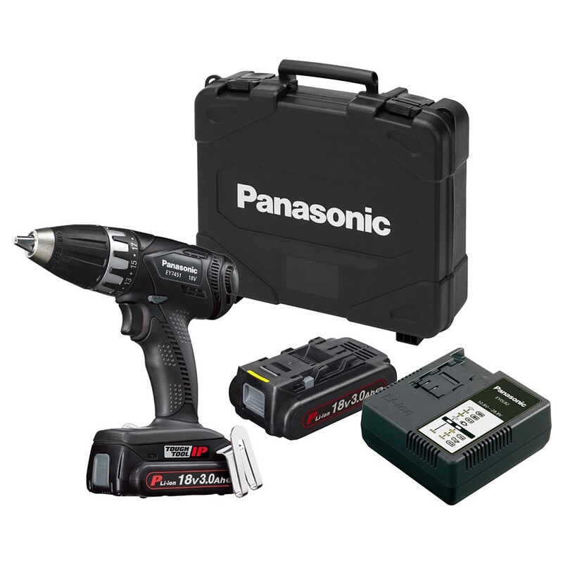 PANASONIC Porakone 18V EY7451PN2S, sarja. Panasonic EY7451PN2S 18V akkuporakone. Kompakti kokoluokka: mitat 68 x 178 x 216 mm ja paino vain 1,0 kg ilman akkua. 13 mm avaimeton istukka. Portaaton nopeudensäätö; pyörintänopeudet: matala 70-400rpm tai korkea 200-1400rpm. Vääntömomentti pehmeä 28Nm ja kova 41,5Nm. 18 momenttiporrasta + pora-asento. Elektroninen istukan jarru, karalukitus. Kokoaaltoelektroniikka. Tärinä ≤ 2,5 m/s2 porattaessa metalliin. Akun lataustason ilmaisin, koneen ja akun ylikuormitussuoja sekä kosteus- ja pölysuojaus Panasonicin Tough Tool IP. LED-työvalo ja vyökoukku parantavat työmukavuutta ja käytettävyyttä. Toimitetaan kestävässä muovisalkussa. Tough Tool IP -malliston työkaluissa on akkukennojen valvontatoiminto, lämpötilan valvonta työskentelyn aikana ja ylipurkautumissuojaus. Kytkin, elektroniikka ja akkukennot on suunniteltu niin, ettei pöly ja kosteus pääse tunkeutumaan laitteen sisälle. Kehittynyt tekniikka takaa työkalujen luotettavan, turvallisen ja tehokkaan toiminnan, myös haastavissa olosuhteissa. Sarja, jossa kaksi 3.0 Ah akkua ja laturi laukussa.
