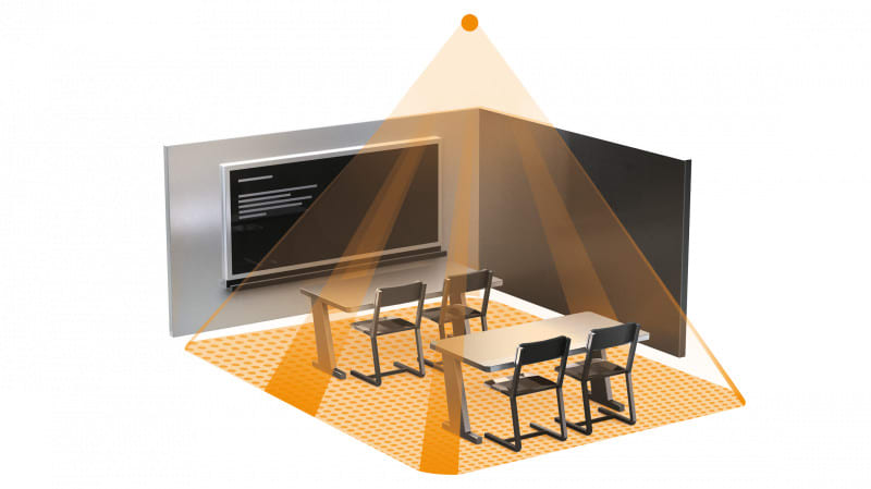 IR Quattro COM2 UP valkoinen PIR-läsnäolotunnistin sisätiloihin. Uppoasennus kattoon, asennuskorkeus 2,5-8 m. Toimintakulma 360°, avauskulma 100°. Läsnäolotunnistusneliö 4x4 m. Hämäräkytkin 10-1000 luksia. Max. 2000 W, IP20. 360° infrapunaläsnäolotunnistin. Läsnäolotunnistusalue 16 m², kattoasennus. Saatavana COM1, COM2, DALI2 APC ja KNX.