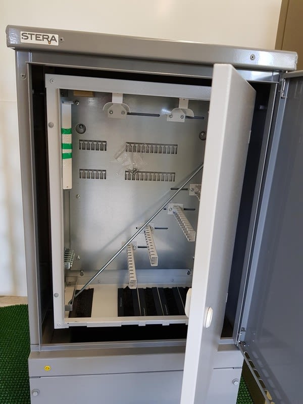 Kaapelijakokaappi EJK0850, teräsjalustalla ETJ0600 sekämikrokuitujatkoskaapilla 7220816, RAL 7037