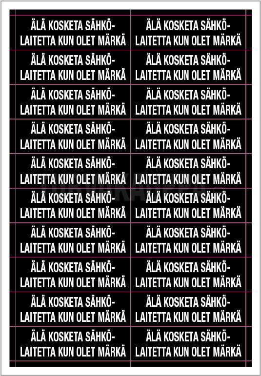 Älä kosketa sähkölaitetta kun olet märkä. Tarra-arkki. Arkissa 20 kpl12x40 mm tarroja.