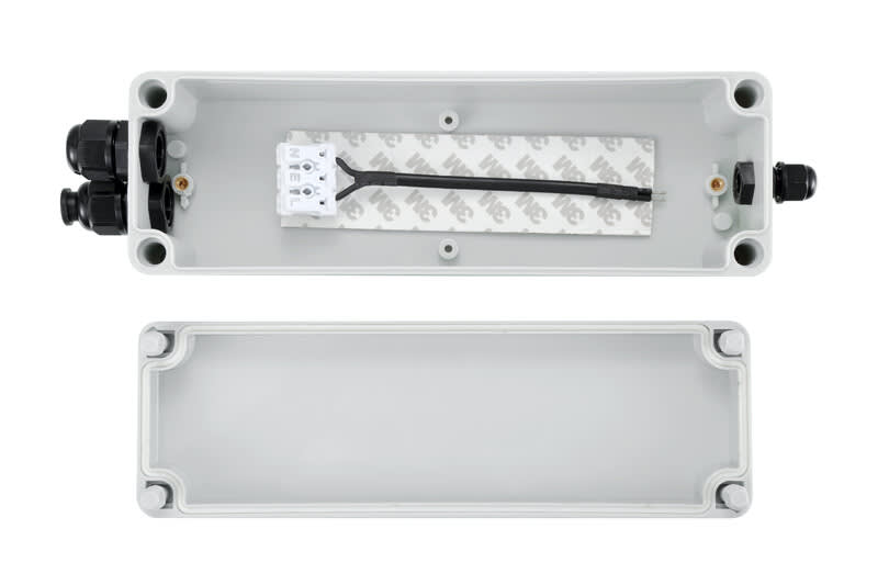 Liitäntälaitekotelo IP65 IP65 liitäntälaitekotelo on tarkoitettu alasvalojen LED-driverien kotelointiin alaslasketuissa kattorakenteissa ulko- ja sisätiloissa. Kotelossa on kolme holkkitiivistettä, joista yksi kotelon toisessa päässä, driverilta valaisimelle kulkevaa johtoa varten ja kaksi toisessa päässä valaisimen ryhmäjohdon ketjuttamiseen (MMJ 3x2,5 mm2). Kotelon mukana toimitetaan erillinen ketjutusliitin välijohdolla. LED-driveriin liittämistä varten. Huomioithan että useimmat LED-valaisimet ovat yläpuoliselta rakenteeltaan IP20, joten niiden soveltuvuus ulkotilojen alaskattorakenteisiin tulee selvittää aina tapauskohtaisesti. Mitat 250 x 72 x 80.