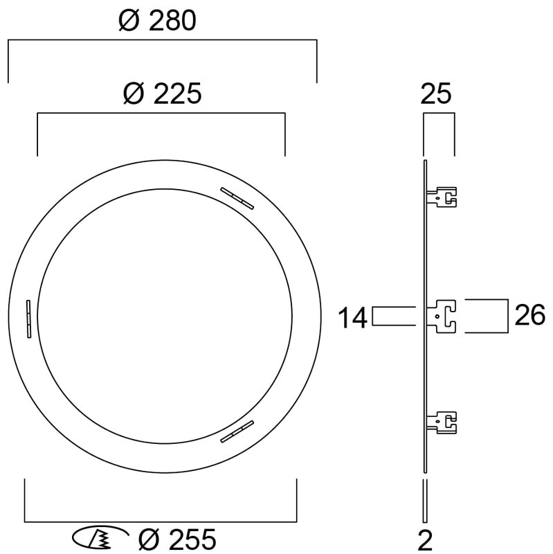Sovituskehys alasvalolle, jonka upotusaukko 225 mm. Kehys soveltuu halkaisijaltaan 255-270 mm asennusreikään, kehyksen halkaisija 280 mm.