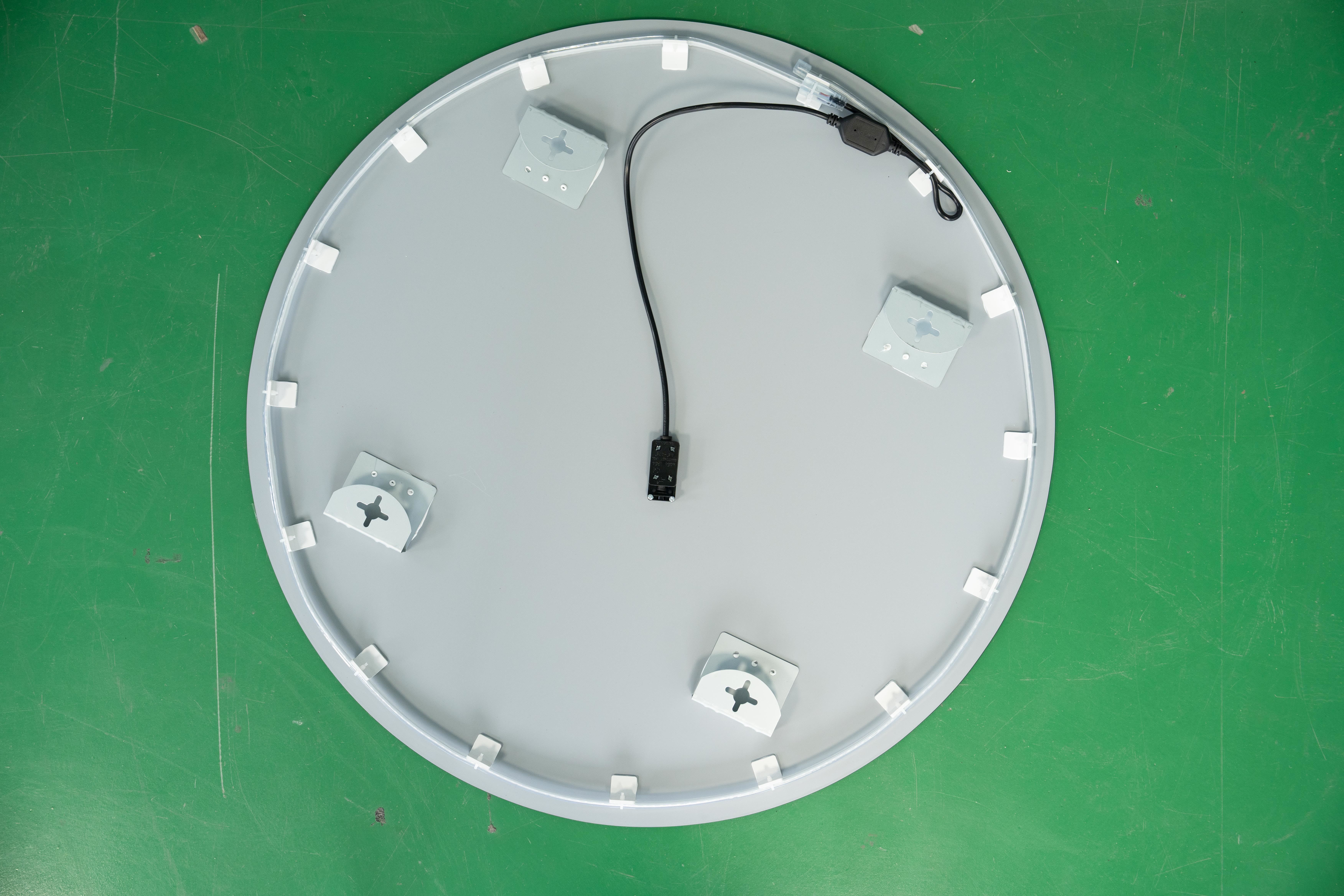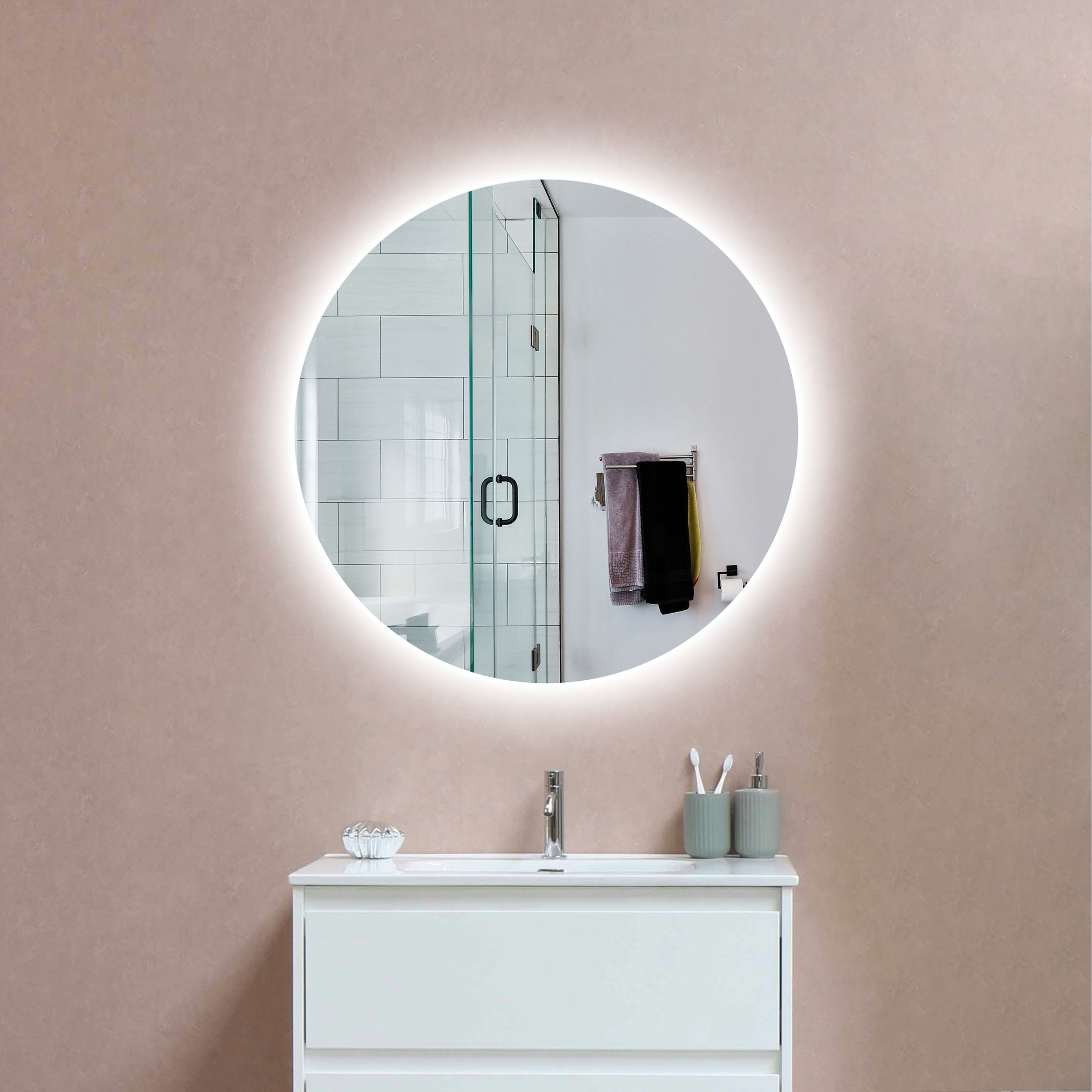 Tuo tilaasi pehmeyttä kehyksettömällä pyöreällä valopeilillä. Peilin LED-valot ovat vaihdettavissa, eikä valopeilissä ole pistorasioita.