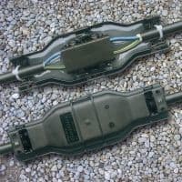 Geelillä täytetty kotelo, vaihejohtimilla 6-25mm2 ruuvijatkosholkit(huom! maadoitusholkki on 6-16mm2).