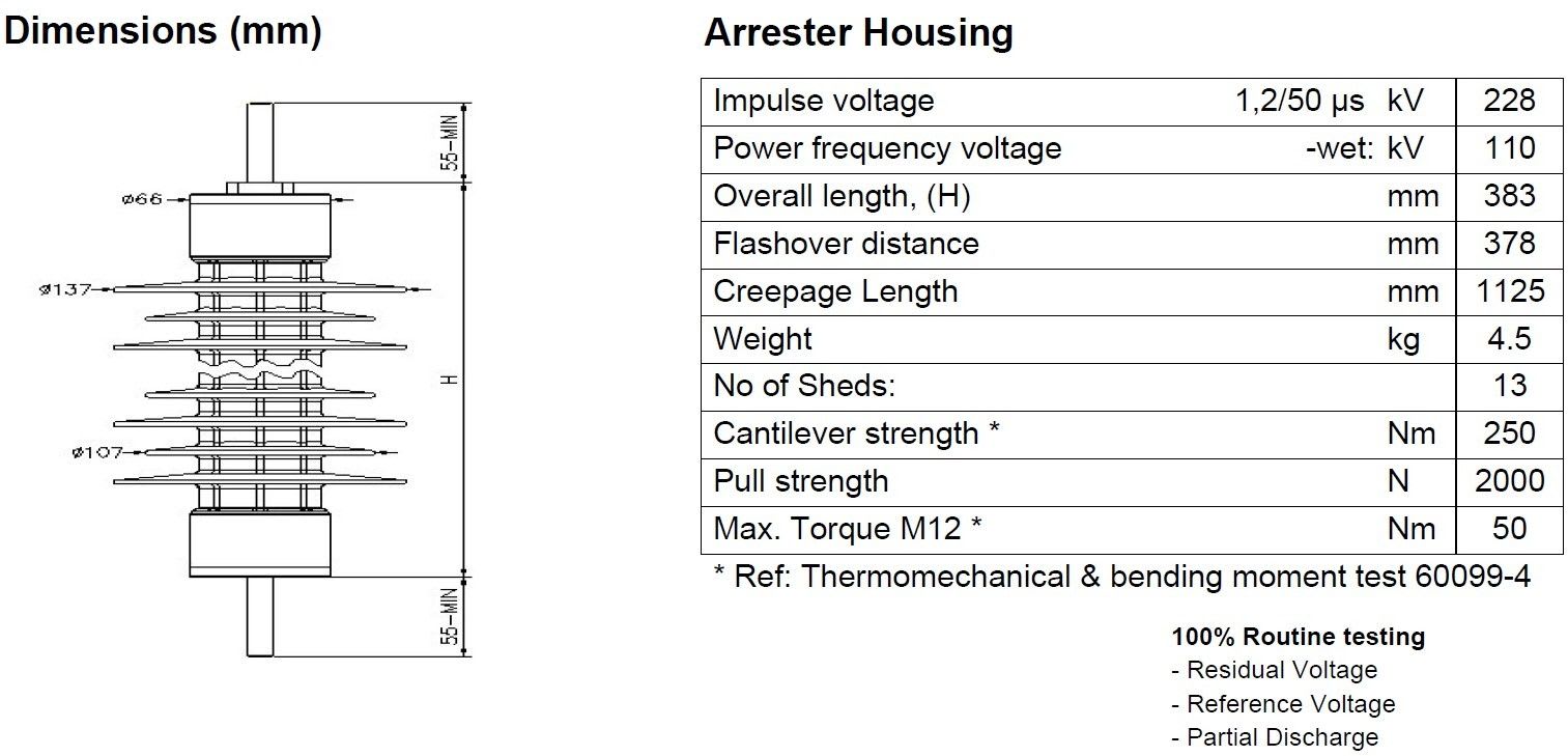 luokan 1(HD) muk. polymeerirunkoinen sinkkioksidiylijännitesuoja,yhtenäinen runkorakenne estää kosteuden pääsyn ylijännitesuojarakenteeseen,erinomainen energianhallintakyky,mekaaninen lujuus ja matala jäännösjännite. testattu IEC60099-4 edition 3 mukaan.