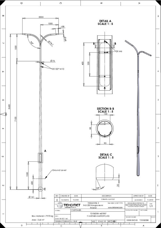 TEHOMET - Teräskartiopylväs - T210B208 teräskartiopylväs