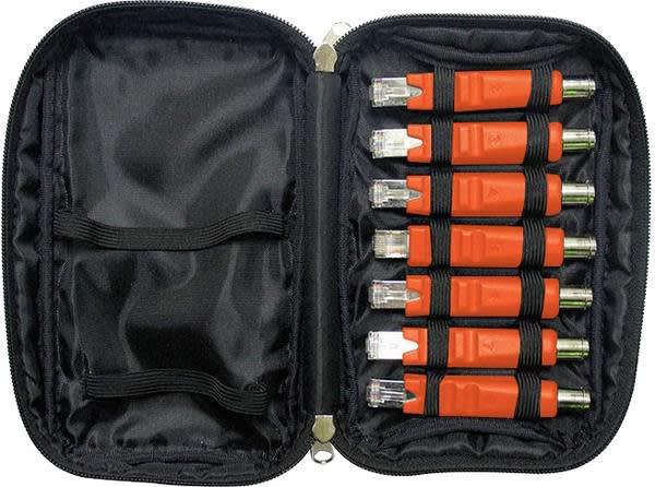 Pakkauksessa seitsemän testi- ja ID (RJ45 ja F-uros) lisäliitäntä -yksikköä sekä kantolaukku etätesti yksiköiden ja NC-500-laitteen sisällön säilyttämistä varten.