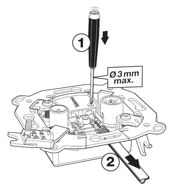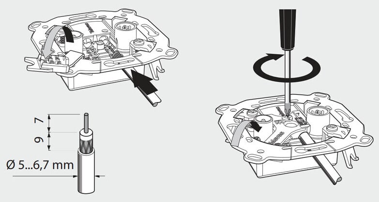 - Yhteensopiva kaapeleiden kanssa, joiden vaipan halkaisija on Ø 5...6,9 mm ja sisäjohtimien halkaisija 0,65...1,2 mm