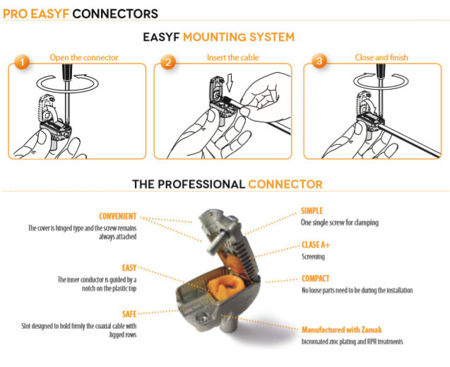 Naaras koaksiaalipistoke eli naaras IEC-liitin. Pistoke puretaan kahteen osaan minkä jälkeen sisäjohdin asennetaan ruuvin alle ja kaapeli on kiinnitetty kun osat on asennettu takaisin. Valmistettu Zamakista.