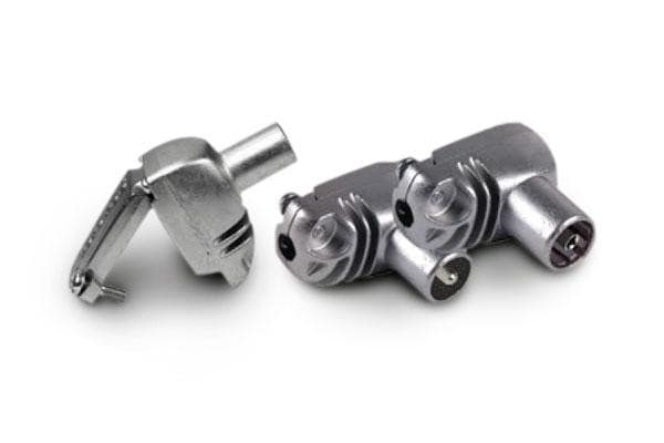 Koaksiaalipistokkeet kulma IEC-uros T413210 ja naaras T413310, myymäläpakkaus