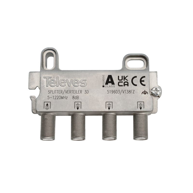 Jaotin kolmeen, 5-1220MHz, 8dB T519603 on jaotin kolmeen F-liittimillä antenni- ja kaapeliTV-verkkoihin. Miniatyyrikokoisten elektronisten komponenttien ansiosta läpimenovaimennus on erittäin pieni ja Zamak-kotelointi takaa hyvän säteilytiiviyden.