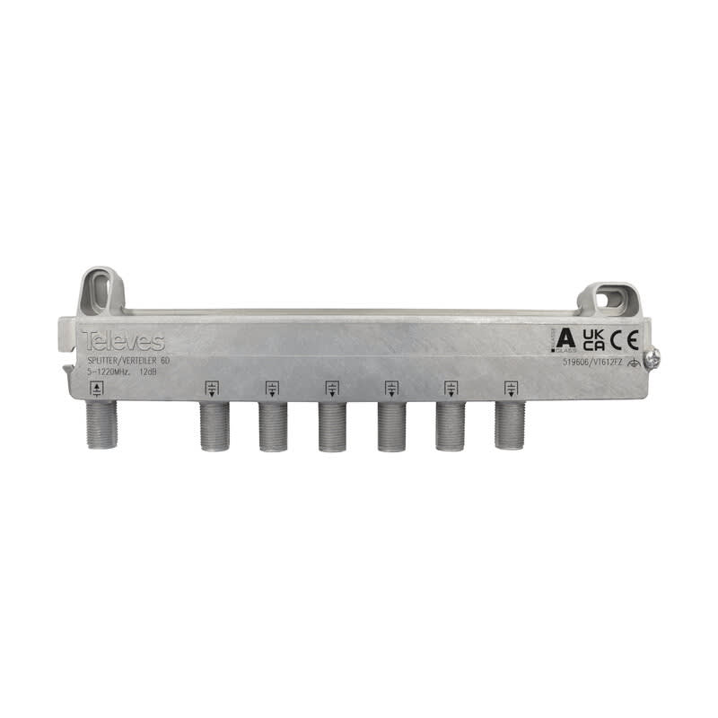 Jaotin kuuteen, 5-1220MHz, 12dB T519606 on jaotin kuuteen F-liittimillä antenni- ja kaapeliTV-verkkoihin. Miniatyyrikokoisten elektronisten komponenttien ansiosta läpimenovaimennus on erittäin pieni ja Zamak-kotelointi takaa hyvän säteilytiiviyden.